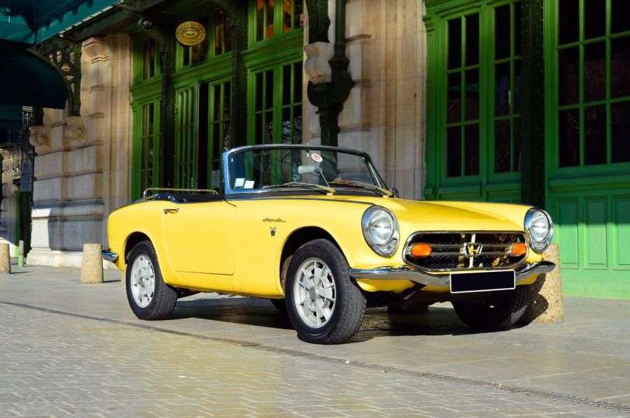 La Honda S800 proposée à la vente est une très rare version cabriolet mise en circulation le 10 Juin 1968. L'auto fut achetée au début des années 1990 par son propriétaire actuel qui l'a entièrement faite restaurer et repeindre à cette époque. L'ancien possesseur de cette S800, lyonnais lui aussi, la détenait depuis 1973, ce qui lui confère une belle histoire. Rouge à l'origine, elle se présente maintenant dans une seyante couleur jaune avec capote noire et intérieur en simili cuir noir également. Des jantes Cosmic MkI, un couvre capote et un porte-bagages chromé viennent compléter son équipement. Le compteur ayant été remis à