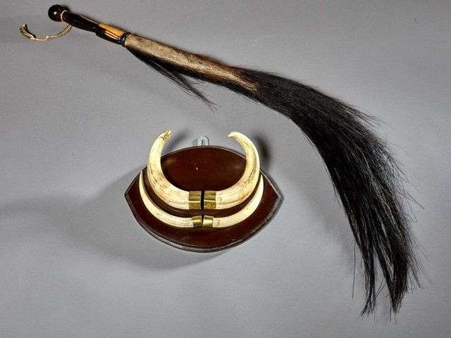On joint un chasse mouche réalisé dans la partie terminale de la queue d'un Gnou bleu (Connochaetes taurinus) (CH) avec insertion manche en bois exotique.
