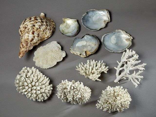 Lot comprenant différents coquillages exotiques dont triton, valve de nacre, coraux récifaux blancs (Scleractinia spp) (II/B pré-convention)