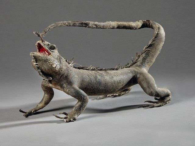 Iguane vert (Iguana iguana) (II/B pré-convention) : spécimen ancien naturalisé en entier présenté gueule ouverte sans socle