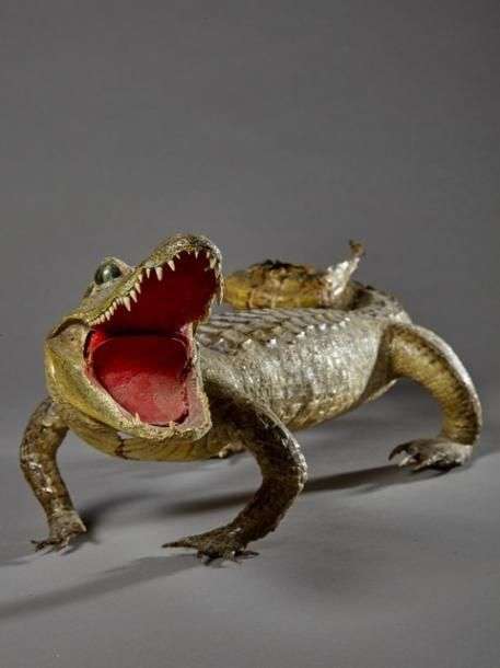 Caïman à lunettes (Caiman crocodilus) (II/B) pré-convention : spécimen ancien naturalisé en entier présenté gueule ouverte