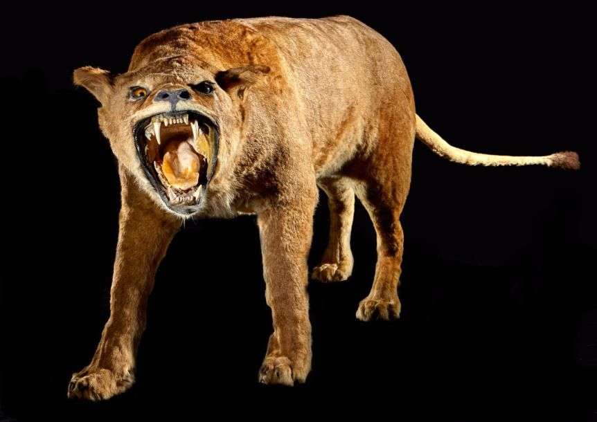 Lion d'Afrique (Panthera leo) (II/B) : spécimen femelle naturalisé gueule ouverte avec crâne véritable sans socle, pièce ancienne avec montage au plâtre Longueur totale 278 cm | Hauteur 87 cm