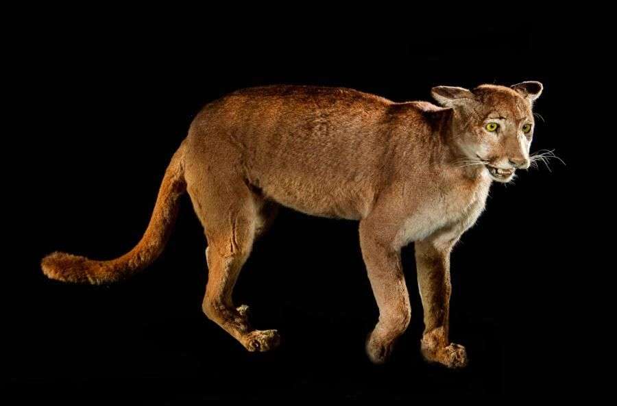 Puma (Felis concolor) (II/B): spécimen naturalisé gueule ouverte en attitu