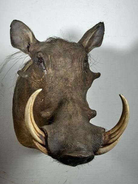 Phacochère d'Afrique (Phacochoerus aethiopicus) (CH) : tête en cape d'un spécimen bien armé (belle configuration des défenses), collectée au Mozambique, Campement Majune Safaris Linchinga 05/10/2009
