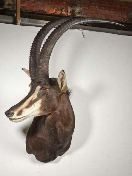 Hippotrague noir (Hippotragus niger) (CH) : tête en cape, collectée au Mozambique (Campement Majune Safaris, Linchinga), belle pièce décorative Longueur étuis cornés : 100 cm environ
