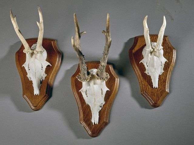 Un lot comprenant 3 massacres de Chevreuil d'Europe (Capreolus capreolus) (CH) sur écusson dont deux portant 6 cors et un portant 3 cors