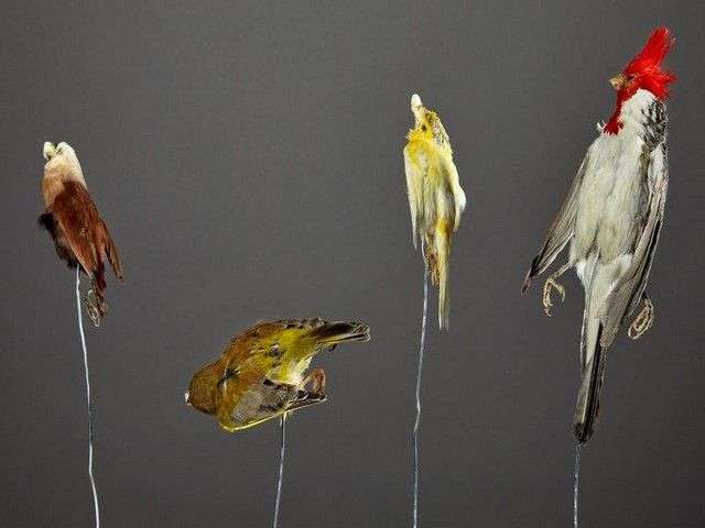 Un lot de 4 mises en peaux pour montage en taxidermie ou peaux plates d'étude dont : 1 canari en phase jaune (Serinus canaria domestica) (D) | 1 verdier d'Europe (Carduelis chloris) (CE) | 1 capucin à tête blanche (Lonchura maja) (NR) 1 paroare huppé (Paroaria coronata) (II/B) pré-convention.