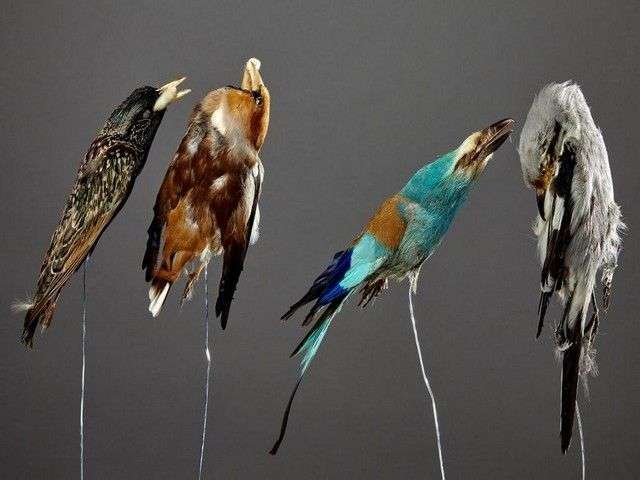 Un lot de 4 mises en peaux pour montage en taxidermie ou peaux plates d'étude dont : 1 pie grièche grise (Lanius excubitor) (CE) | 1 grosbec casse-noyaux (Coccothraustes coccothraustes) (CE) | 1 étourneau sansonnet en phase estivale (Sturnus vulgaris) (CH) | 1 rollier d'Abyssinie (Coracias abyssinicus) (NR)