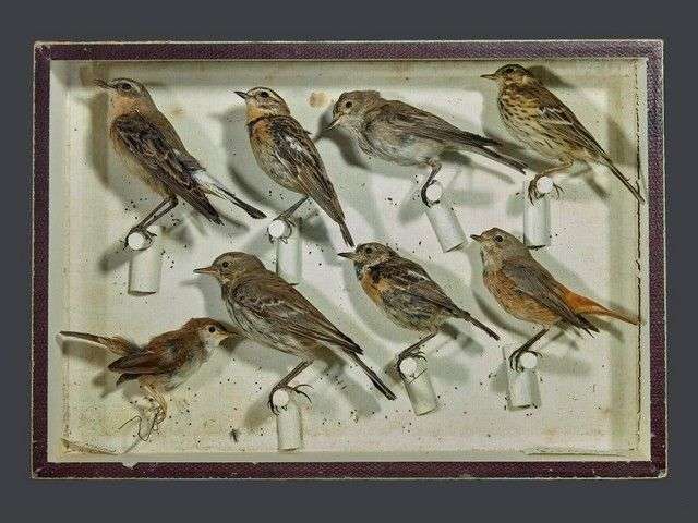Boîte entomologique vitrée contenant 8 spécimens naturalisés de petits passereaux dont : 1 traquet motteux (Oenanthe oenanthe) (CE) | 1 fauvette spp Collection Jacques BARBONI, spécimens préparés avant 1970, en bon état