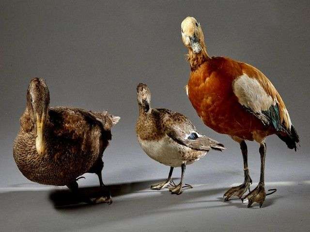 Un lot de 3 spécimens naturalisés dont : 1 canard eider femelle spp | 1 tadorne casarca (Tadorna ferruginea) (CE) | 1 canard pilet (Anas acuta) (CH)