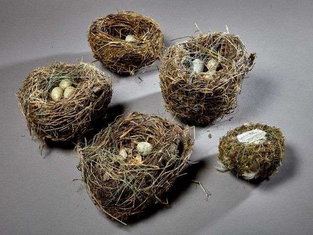 Un lot comprenant 4 nids avec œufs de merle noir (Turdus merula) (CH) et un nid de verdier d'Europe (Carduelis chloris) (CE)