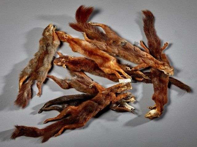 Un ensemble de fragments de peaux dont zèbre de Burchell (Equus burchelli) (NR) | antilopinae spp (NR) | chamois d'Europe (Rupicapra rupicapra) (CH) | jeune husky (Canis lupus familiaris) (D) | cerf élaphe (Cervus elaphus) (CH) | genette d'Afrique (Genetta genetta) (NR) et un lot de peaux d'écureuils roux (Sciurus vulgaris) (CE) datant de 1968