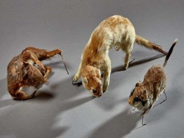 Lot de 3 spécimens de mammifères naturalisés dont Ecureuil roux (Sciurus vulgaris) (CE), Hermine avec pelage transitoire (Mustela erminea) (CE), Lérot (Eliomys quercinus) (NR)