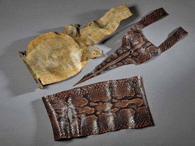 Un lot comprenant : une peau entière de varan spp (Varanus spp) II/B) pré-convention des fragments de peau de Python de seba (Python sebae) (II/B) pré-convention
