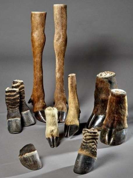 Lot comprenant un ensemble de pattes diverses pour montage en pied de lampe et cendrier comprenant : 2 pieds de Buffle (Syncerus caffer) (CH) | 2 pattes d'antilope spp (Antilopinae spp) (CH) | 4 pattes de Zèbre de Burchell (Equus burchelli) (CH) et 2 pattes de Cerf élaphe (Cervus elaphus) (CH)