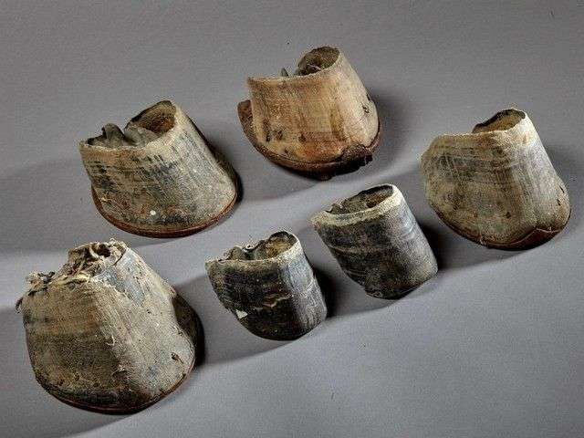 Lot pour montage en orfèvrerie comprenant 2 sabots de Zèbre de Burchell (Equus burchelli) (CH), 4 sabots de cheval domestique (Equus caballus) (D) avec fer à cheval