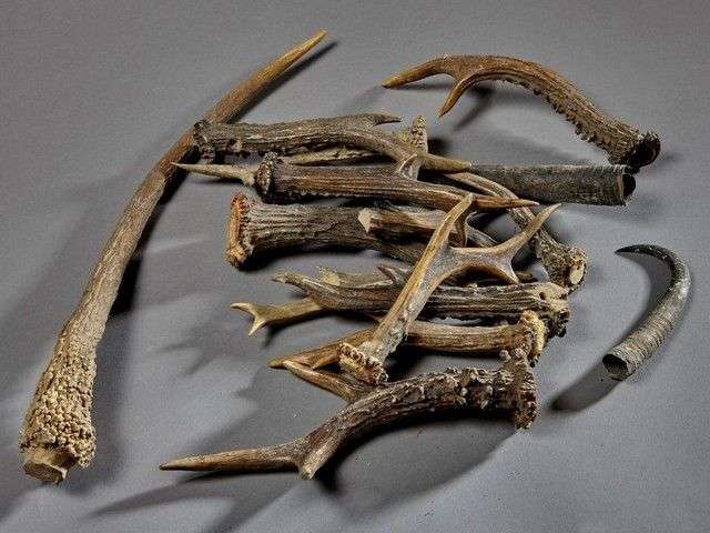 Un ensemble de cornes et mues de Chevreuil d'Europe (Capreolus capreolus)