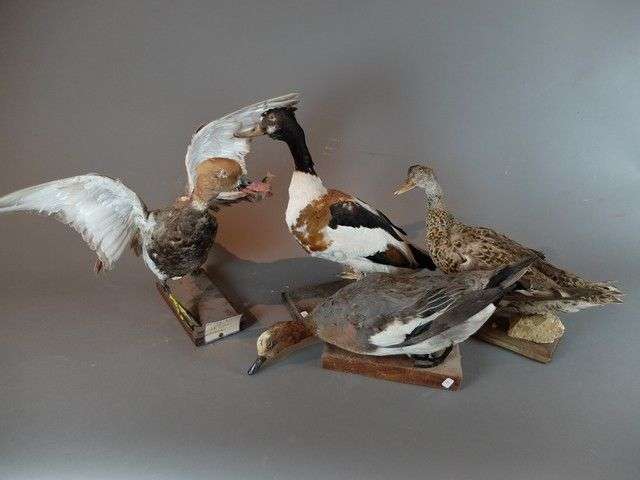 Lot de 4 spécimens naturalisés en entier comprenant : Nette rousse (Netta rufina) (CE) mâle ailes écartées naturalisé le 7/06/75, Canard colvert (Anas platyrhynchos) (CH) femelle, Canard siffleur (Anas penelope) (CH) mâle, Tadorne de belon (Tadorna tadorna) (CE) mâle.