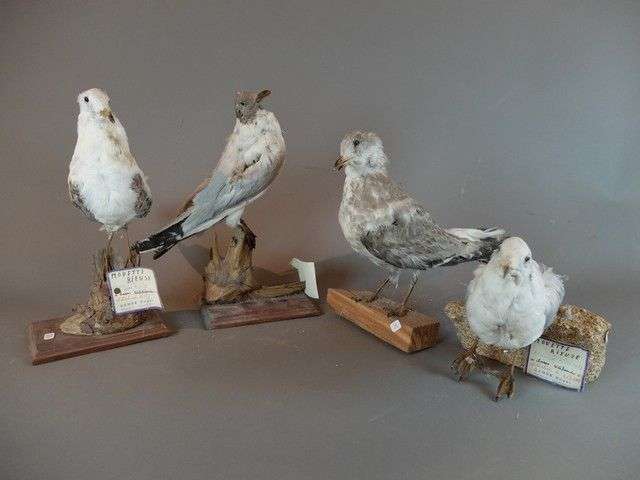 Lot de 4 spécimens naturalisés en entier comprenant : 3 Mouette rieuse (Larus rudibundus) (CE) dont une naturalisée le 4/09/73 et une autre le 2/08/75, 1 Laridae spp (CE)