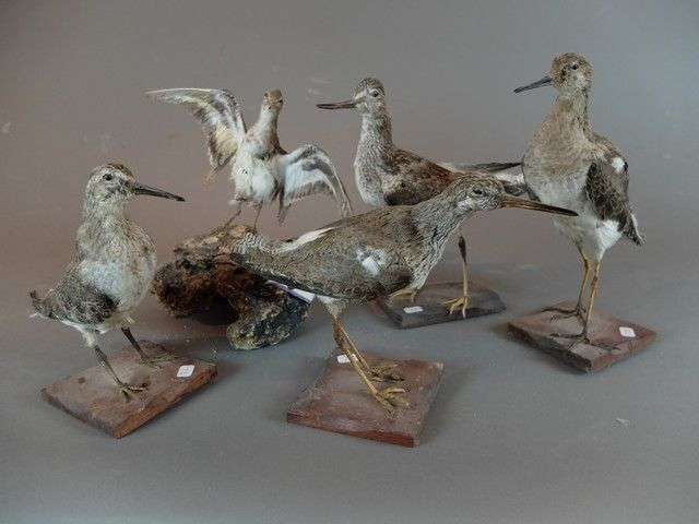 Lot de 5 spécimens naturalisés en entier sur socle comprenant différentes espèces de Scolopacidae dont Chevalier gambette (Tringa totanus) (CE), Chevalier aboyeur (Tringa nebularia) (CE), Chevalier guignette (Tringa hypoleucos) (CE) naturalisé le 24/06/75 représenté ailes ouvertes.