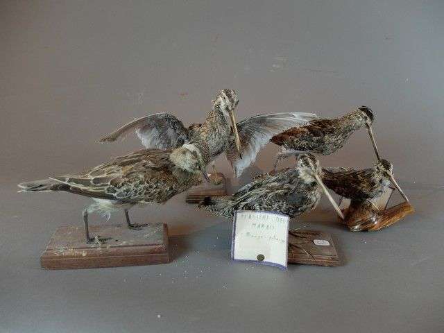 Lot de 5 spécimens naturalisés en entier comprenant : Bécassine sourde (Lymnocryptes minimus) (CH), 3 Bécassines des marais (Gallinago gallinago) (CH) dont une ailes écartées, pluvier doré (Pluvialis apricaria) (CH)
