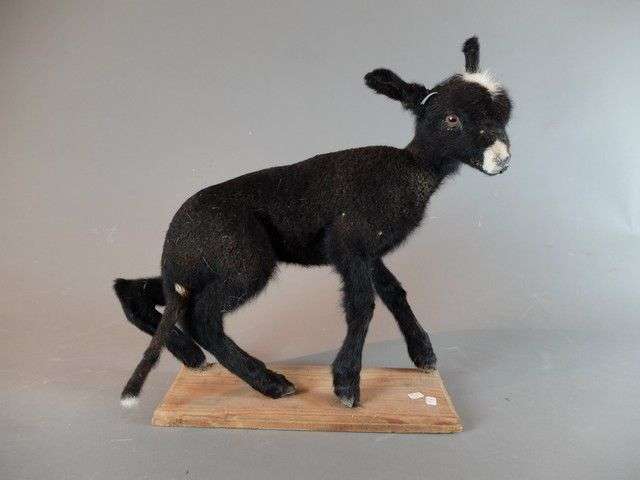 Mouton domestique (Ovis aries) (D) : spécimen juvénile de coloration noire, naturalisé en entier