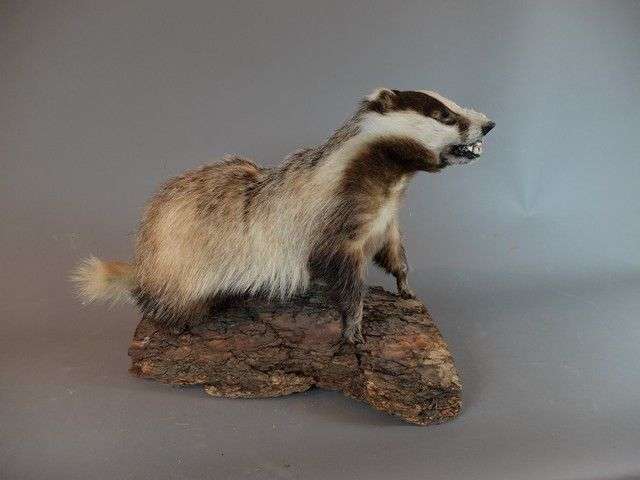 Lot de 3 spécimens de Blaireau d'Europe (Meles meles) (CH) naturalisés en entier dont un représenté en station bipède