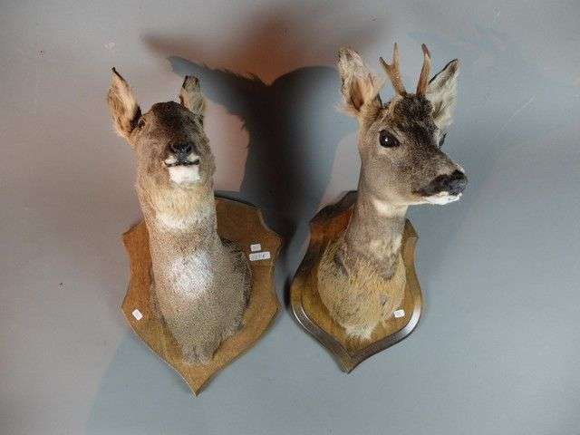 Lot de 4 têtes naturalisées sur écusson en bois dont : 2 Chevreuil d'Europ