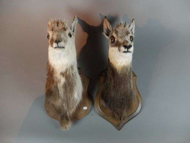 Lot de 4 têtes naturalisées sur écusson en bois dont : Mouflon d'Europe (Ovis ammon) (CH), 2 Chamois d'Europe (Rupicapra rupicapra) (CH), Chevreuil d'Europe (Capreolus capreolus) (CH)