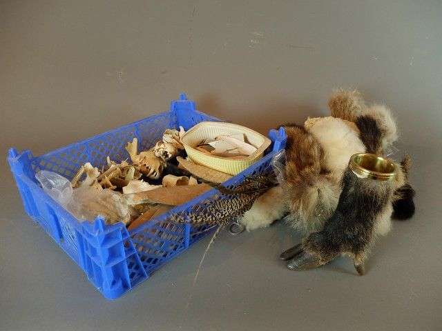 Lot comprenant : 2 poissons, queues de renard et de mouton, patte de sanglier montée en orfèvrerie, lot de pièces ostéologiques avec crâne de lièvre d'Europe et de renard roux et divers, plumes