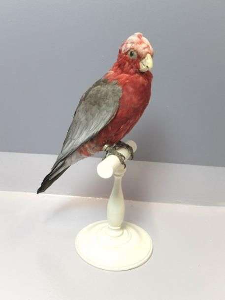 Cacatoès rosalbin (Eolophus roseicapilla) (II/B) bagué : spécimen naturalisé sur perchoir en bois