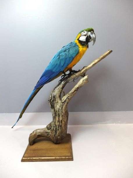 Ara bleu et jaune ou Ara ararauna (Ara ararauna) (II/B-CE) bagué : spécimen naturalisé sur racine et socle, beaux coloris, idéal décoration