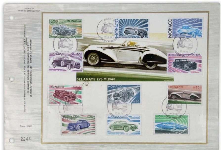 Planche de 11 timbres de collection oblitérés par la Principauté de Monaco le 12 Novembre 1975 reprendant plusieurs modèles d'exception de la production automobile