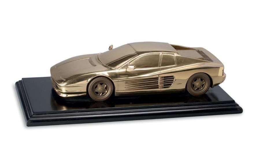 Bronze à patine dorée d'une Ferrari Testarossa sur socle en bois précieux noir.