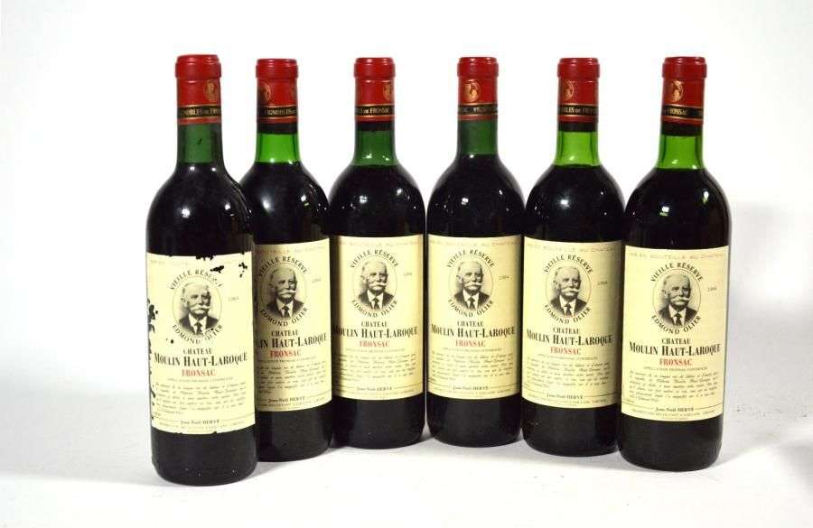 6 B CHÂTEAU MOULIN HAUT LAROQUE VIEILLE RÉSERVE EDMOND OLIER (Caisse Bois) H.E.+ ou mieux| 1 e.t.a. Fronsac 1964