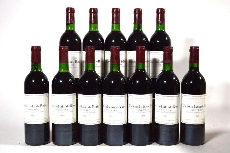 12 B CHÂTEAU LALANDE BORIE (Caisse Bois) 11 B.G. ou mieux| 1 T.L.B| e.l.s. + quelques accrocs Saint Julien 1982