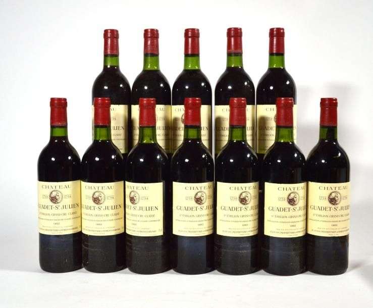 12 B CHÂTEAU GUADET SAINT JULIEN (Caisse Bois) 11 B.G. ou mieux| 1 T.L.B| 5 e.l.a. et 2 e.a. GCC St Emilion 1982