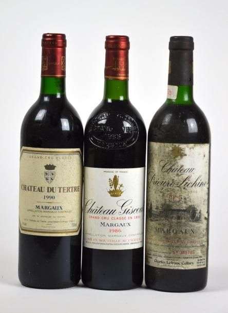 1 B CHÂTEAU DU TERTRE (e.t.) GCC5 Margaux 19901 B CHÂTEAU GISCOURS (B.G.-| e.l.s.) GCC3 Margaux 19861 B CHÂTEAU PRIEURE LICHINE (H.E.+| e.t. fortes| Pass USA| 1 accroc capsule) GCC4 Margaux 1985