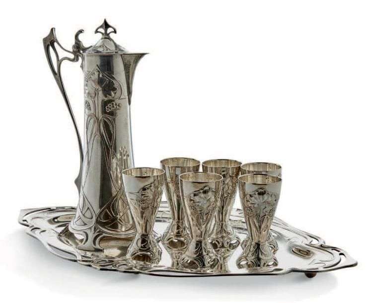 Service à liqueur en métal argenté à décor de volutes et feuilles de vignes comprenant une verseuse, 6 verres et un plateau de présentation.