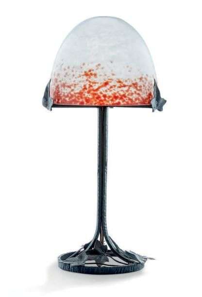 Lampe champignon à fût en métal martelé à décor de feuilles de vigne et l'abat-jour en verre multicouche blanc-orangé moucheté.