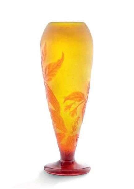 Vase ovoïde en verre multicouche jaune à décor dégagé à l'acide de fleurs orangées.