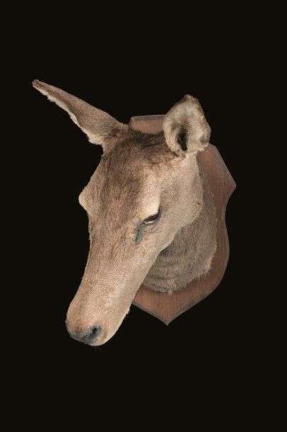 Cerf élaphe (Cervus elaphus) (CH) : tête naturalisée sur écusson d’un spécimen femelle