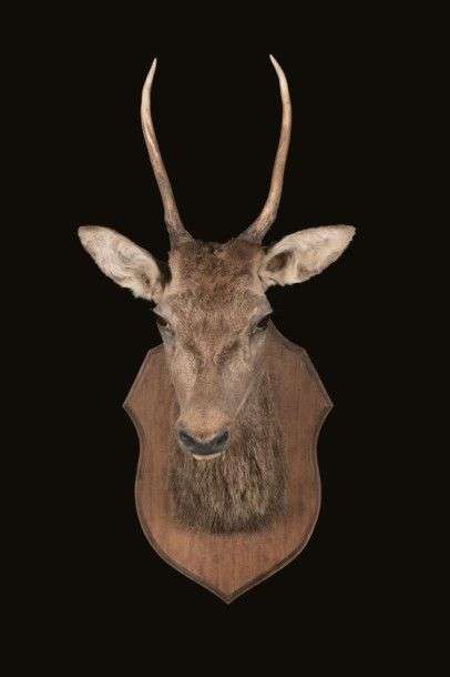 Cerf élaphe (Cervus elaphus) (CH) : tête naturalisée sur écusson d’un daguet