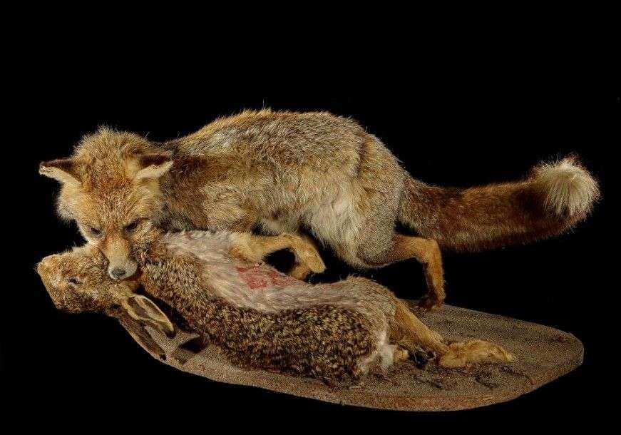 Diorama figurant un Renard commun (Vulpes vulpes) (CH) tenant sa proie (un lièvre d’Europe (Lepus europaeus) (CH)) dans la gueule et ayant commencé à le dépecer