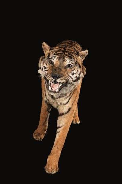 Tigre (Panthera tigris) (I/A) : spécimen de grande taille naturalisé gueule ouverte en attitude de marche, accidents sur la peau (chutes de poils) néanmoins belle pièce décorative