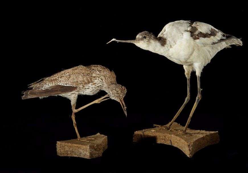 Un ensemble de 2 spécimens naturalisés sur socle comprenant 1 Chevalier gambette (Tringa totanus) (CE) et 1 Avocette élégante (Recurvirostra avosetta) (CE), accidents en l’état