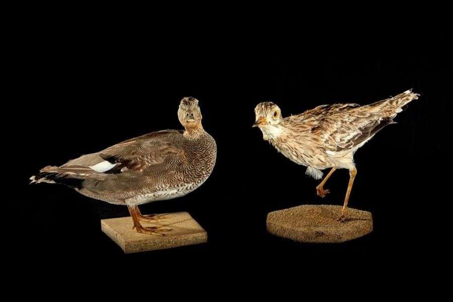 Un ensemble de 2 spécimens naturalisés sur socle comprenant 1 Oedicnème criard (Burhinus oedicnemus) (CE) et 1 Canard chipeau (Anas strepera) (CH)