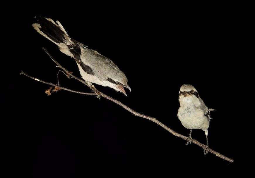 Pie grièche grise (Lanius excubitor) (CE) : 2 spécimens anciens naturalisés sur branche