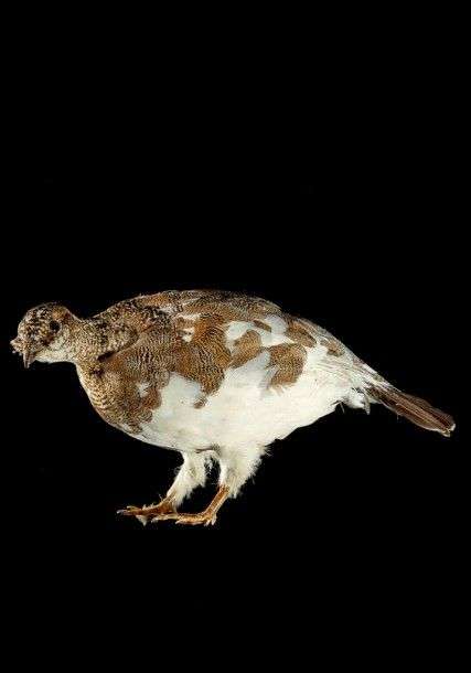 Un ensemble de 2 spécimens naturalisés sans socle de Lagopède alpin (Lagopus mutus) (CE) en phase transitoire automnale et en phase hivernale, en l’état