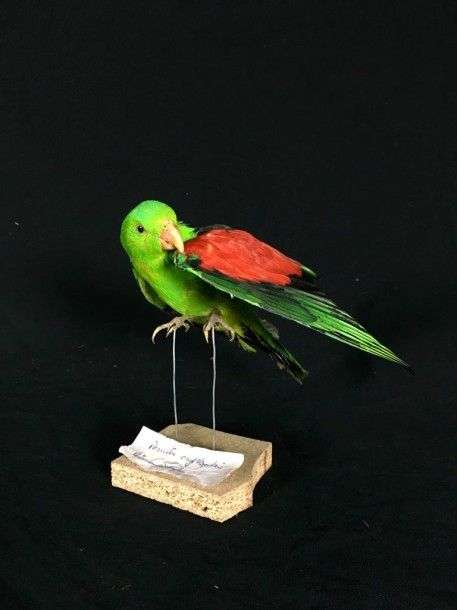 Perruche erythroptère (Aprosmictus erythropterus) (II/B) : spécimen naturalisé sur présentoir provisoire en attitude de nettoyage, beaux coloris